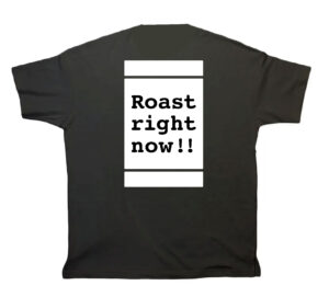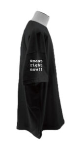 右肩と背面にはRoast right now!!の文字とロゴ入りです。